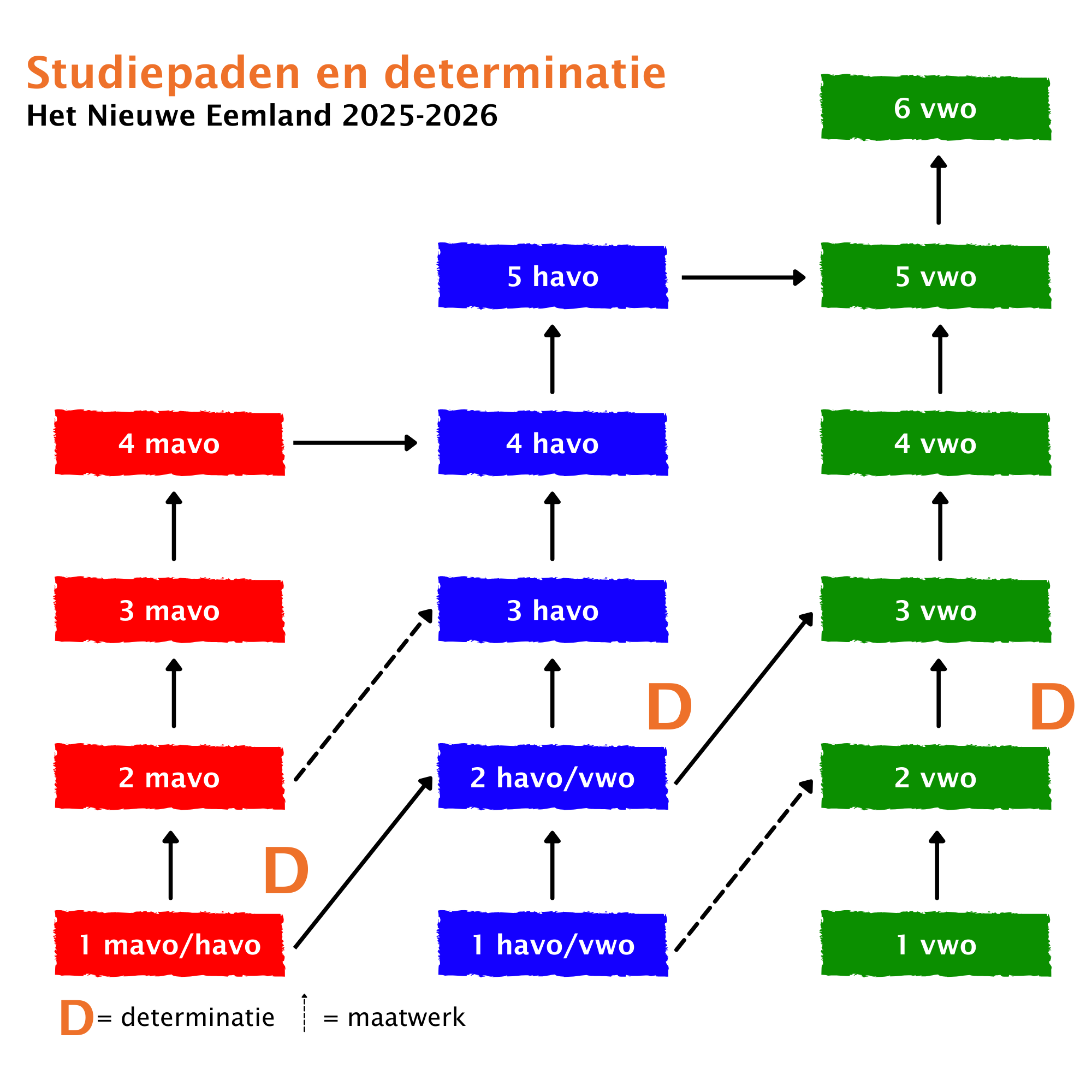 Wij vinden het belangrijk dat alle leerlingen op de juiste plek zitten. Maatwerk is daarbij het sleutelwoord. Is het voor jou beter om tussentijds een ander studiepad te vervolgen (bijvoorbeeld van havo/vwo 1 naar vwo 2 of van mavo 2 naar havo 3), dan kijken we als docententeam wat het beste bij je past. Kijk hieronder/hiernaast voor de gangbare studiepaden op Het Nieuwe Eemland.